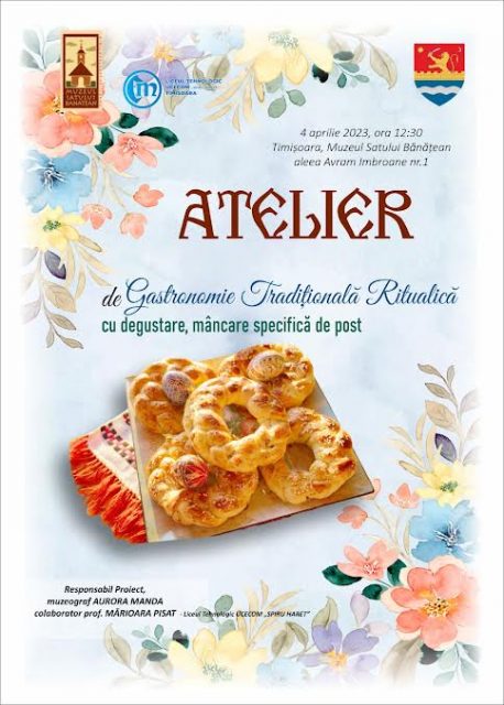Un „Atelier de gastronomie tradițională ritualică cu degustare, mâncare specifică de post” este organizat de Muzeul Satului Bănățean în colaborare cu prof. Mărioara Pisat de la liceul tehnologic „Spiru Haret” din Timișoara, pentru a marca obiceiurile culinare din Postul Mare de 40 de zile care precede Sfintele Paști, cel mai lung și cel mai greu post din an, precum și rânduielile din Săptămâna Patimilor, ultima dinaintea marii marii sărbători creștine. Fasolea, varza, grâul și colacii sunt principalele bucate de post care vor fi pregătite la fața locului în atelierele de lucru cu tinerii.