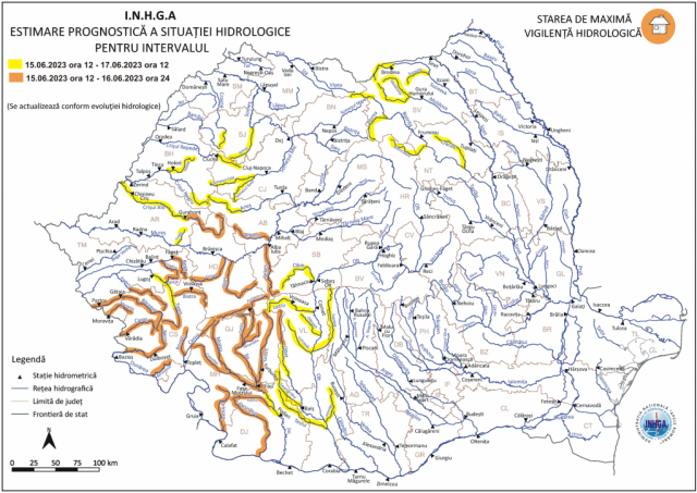 În intervalul 15 iunie 2023 ora 12:00 – 17 iunie 2023 ora 12:00, este cod galben pe râurile din bazinele hidrografice: Someşul Mic – bazin superior şi afluenţi bazin mijlociu şi inferior (judeţele: Bihor şi Cluj), Someş – afluenţii mici aferenţi sectorului aval S.H. Dej (judeţele: Cluj, Sălaj, Maramureş şi Satu Mare), Crasna – bazin superior şi afluenţi bazin mijlociu şi inferior (judeţele: Sălaj şi Satu Mare), Crişul Repede – bazin superior şi afluenţi bazin mijlociu şi inferior (judeţele: Cluj şi Bihor), Crişul Negru – bazin superior şi afluenţi bazin mijlociu şi inferior (judeţele: Bihor şi Arad), Crişul Alb (judeţele: Hunedoara şi Arad), Arieş – bazin amonte S.H. Baia de Arieş şi afluenţii aferenţi sectorului aval S.H. Baia de Arieş (judeţele: Alba şi Cluj), Mureş – afluenţii aferenţi sectorului aval confluenţă cu râul Arieş – amonte confluenţă cu râul Târnava (judeţele: Alba şi Cluj), Mureş – afluenţii aferenţi sectorului aval confluenţă cu râul Târnava (judeţele: Alba, Hunedoara, Sibiu şi Arad), Bega – bazin amonte S.H. Făget şi afluenţii aferenţi sectorului aval S.H. Făget – amonte S.H. Remetea (judeţul Timiş), Timiş – bazin amonte S.H.