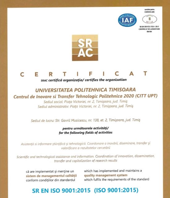 Centrul de Inovare și Transfer Tehnologic din cadrul Universității Politehnica Timișoara a obținut Certificarea ISO 9001:2015 pentru implementarea și menținerea unui Sistem de Management al Calității (SMC), privind activitățile de asistență și informare științifică tehnologică, dar și coordonarea inovării, diseminarea, transferul și valorificarea rezultatelor cercetării.