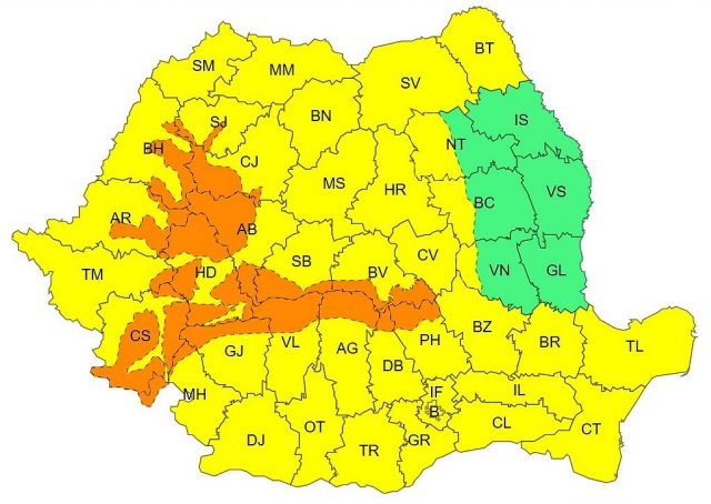 Cod galben – sâmbătă, ora 10:00 – duminică ora 3:00 – intensificări ale vântului în cea mai mare parte a țării, viscol și ninsori moderate cantitativ la munte, ninsori viscolite în Maramureș și Transilvania