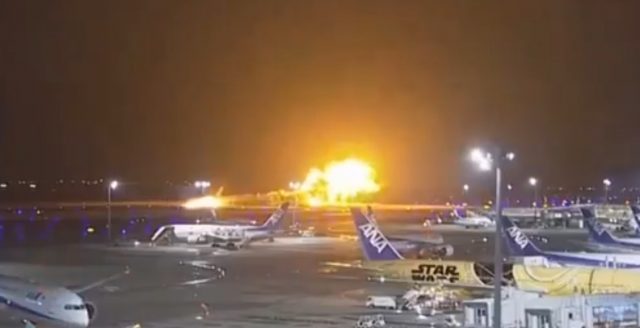 Avionul de pasageri a luat foc în timp ce ateriza pe pista aeroportului din capitala Japoniei, Tokyo. Unele surse susțin că avionul a lovit o aeronavă a Gărzii de Coastă în timp ce se apropia de aeroportul Haneda, potrivit Reuters.