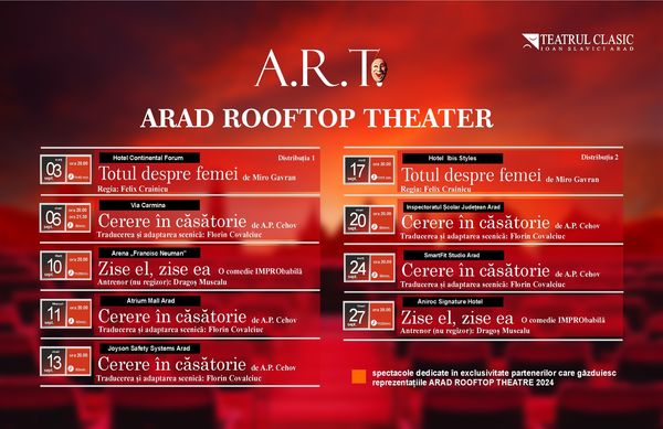 În noua stagiune, teatrul clasic „Ioan Slavici” din Arad lansează un program-pilot experimental, „A.R.T. / Arad Rooftop Theater” cu spectacole care vor avea loc în spații inedite, deocamdată dedicate doar partenerilor care găzduiesc aceste spectacole. Ele vor fi jucate pe acoperișurile unor hoteluri sau clădiri precum Atrium Mall, clădirea de birouri a fabricii Joyson Safety Systems, clădirea inspectoratului școlar, în sala de fitness SmartFit Studio din incinta Ziridava, în hotelurile Aniroc Signature, Continental Forum și Ibis Styles, precum și în cartierul rezidențial Via Carmina sau pe o terasă interioară a arenei „Francisc Neuman”.