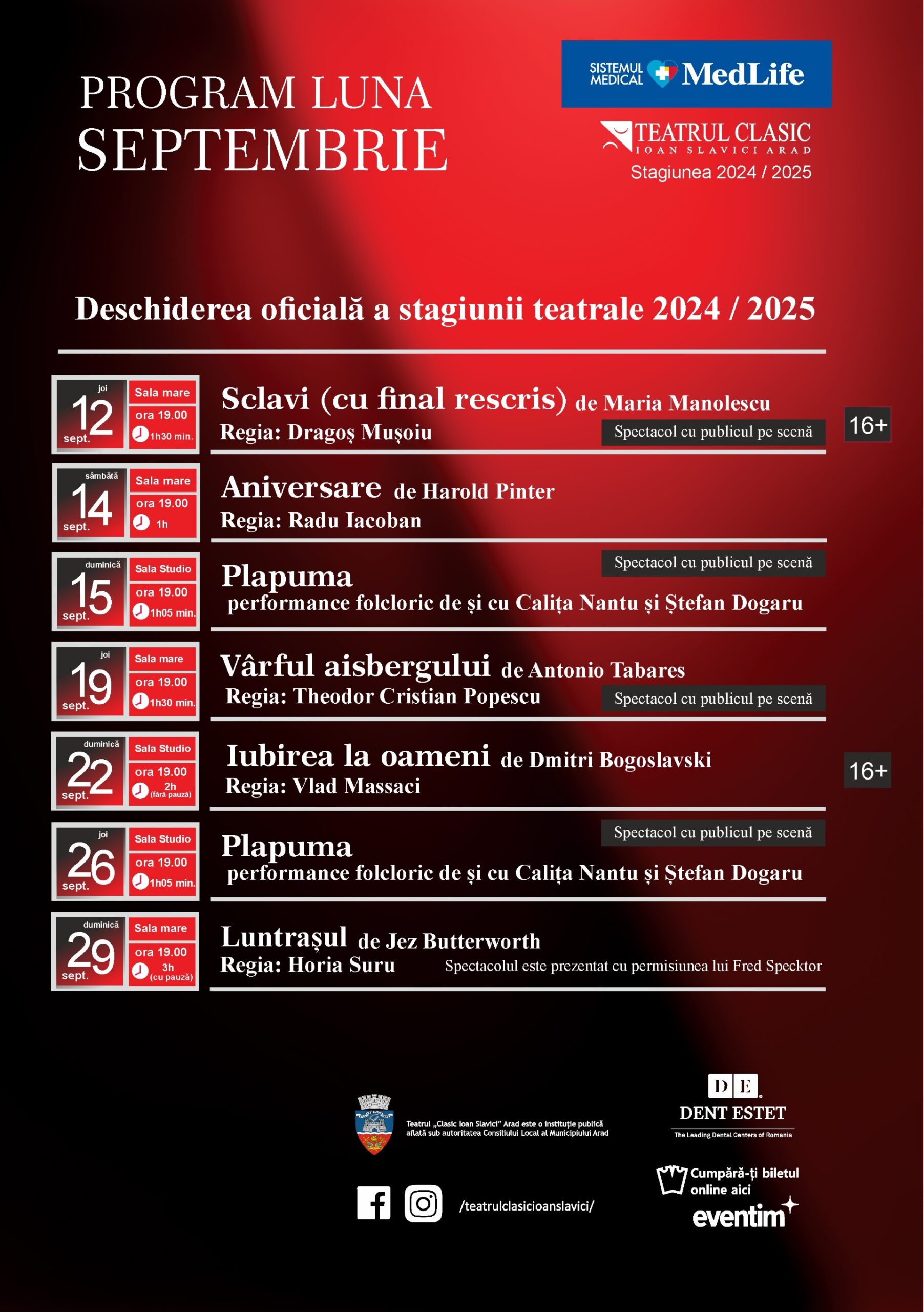 Spectacolul „Totul despre femei” de Miro Gavran va avea loc în 3 septembrie la Hotel Continental Forum și în 17 septembrie, la Hotel Ibis Styles. În 6 septembrie, Via Carmina va găzdui spectacolul „Cerere în căsătorie”, după A.P. Cehov iar în 11 septembrie, același spectacol va fi jucat la Atrium Mall, în 13 septembrie la Joyson Safety Systems, în 20 septermbrie la inspectoratul școlar iar în 24 septembrie la SmartFit Studio. În 10 septembrie, arena „Francisc Neuman” va găzdui spectacolul „Zise el, zise ea”, o comedie IMPRObabilă, având ca antrenor (nu regizor) pe Dragoș Muscalu, care va fi jucat în 27 septembrie și la Aniroc Signature Hotel.