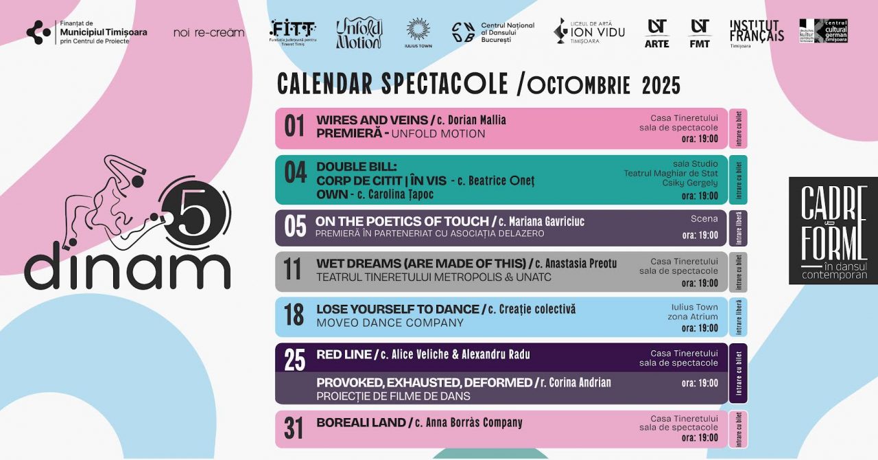 Luna octombrie aduce la Timișoara cea de-a V-a ediție a stagiunii de dans contemporan „Dinam”, programul din acest an incluzând spectacole de dans naționale și internaționale, o proiecție de filme de dans și o instalație performativă, dar și ateliere de dans contemporan care se adresează tinerilor artiști din oraș. Prin programul oferit, se dorește diversificarea ofertei culturale și creșterea vizibilității dansului contemporan în Timișoara.