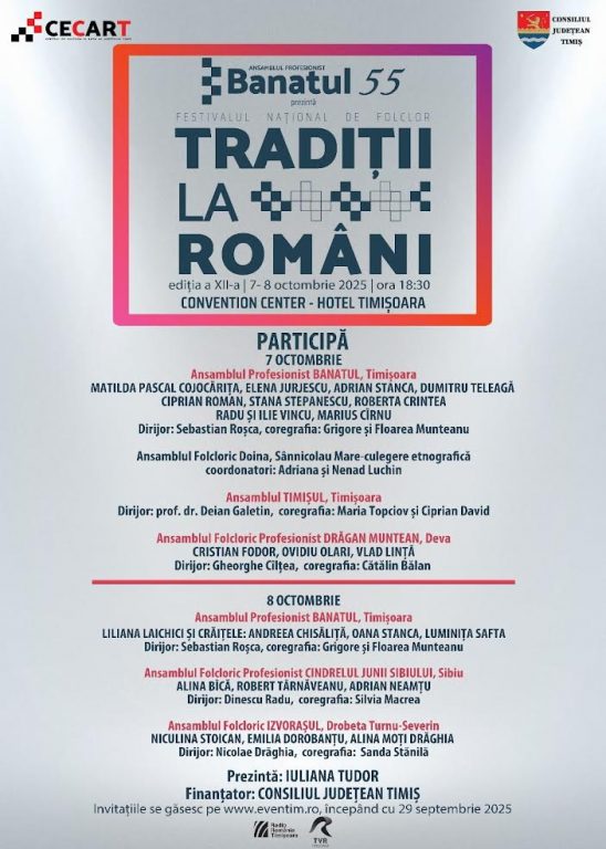 Centrul de Cultură și Artă al Județului Timiș organizează în 7 și 8 octombrie cea de-a XII-a ediție a Festivalului Național de Folclor „Tradiții la Români”, care va avea loc la Convention Center –Hotel Timișoara. Festivalul dorește să pună în valoare patrimoniul cultural timișean și să ofere publicului întâlnirea cu nume de referință ale folclorului.
