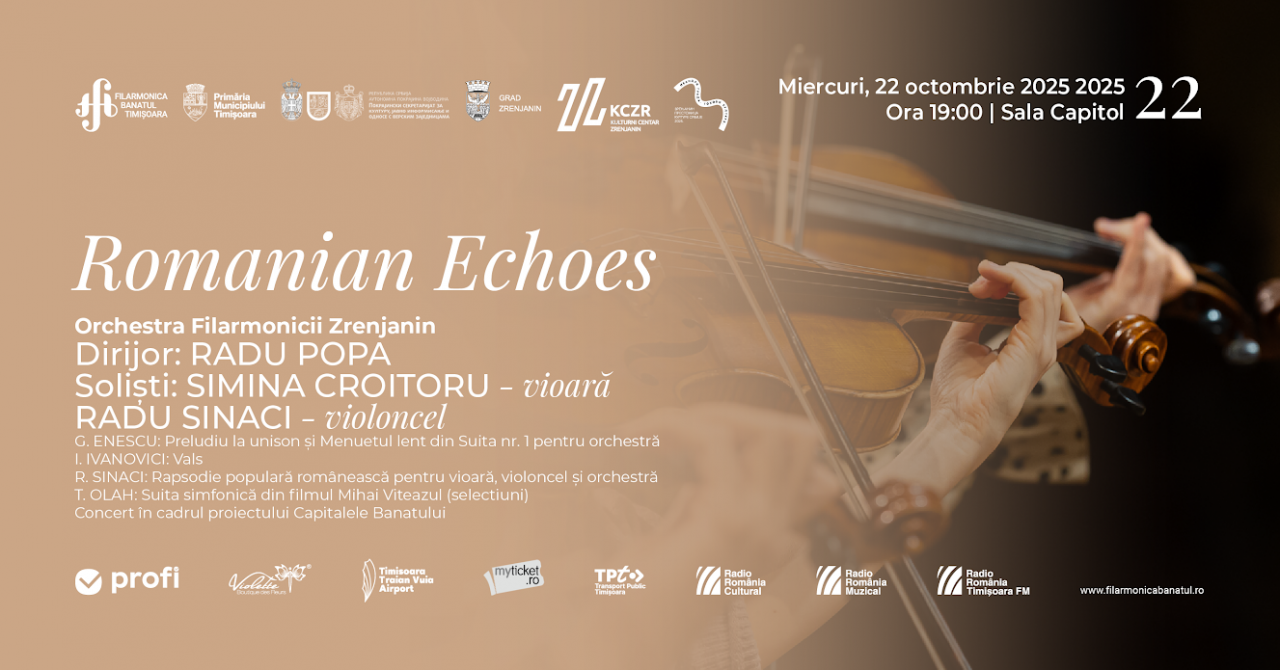 Săptămâna continuă cu concertul transfrontalier „Romanian Echoes”, un eveniment dedicat colaborării culturale România–Serbia, susținut de Orchestra Filarmonicii din Zrenjanin.Acesta va avea loc în 22 octmbrie, la sala Capitol, sub conducerea maestrului Radu Popa, alături de soliștii Simina Croitoru (vioară) și Radu Sinaci (violoncel). Proiectul face parte din programul oficial Zrenjanin – Capitala Națională a Culturii în Serbia, 2025.
