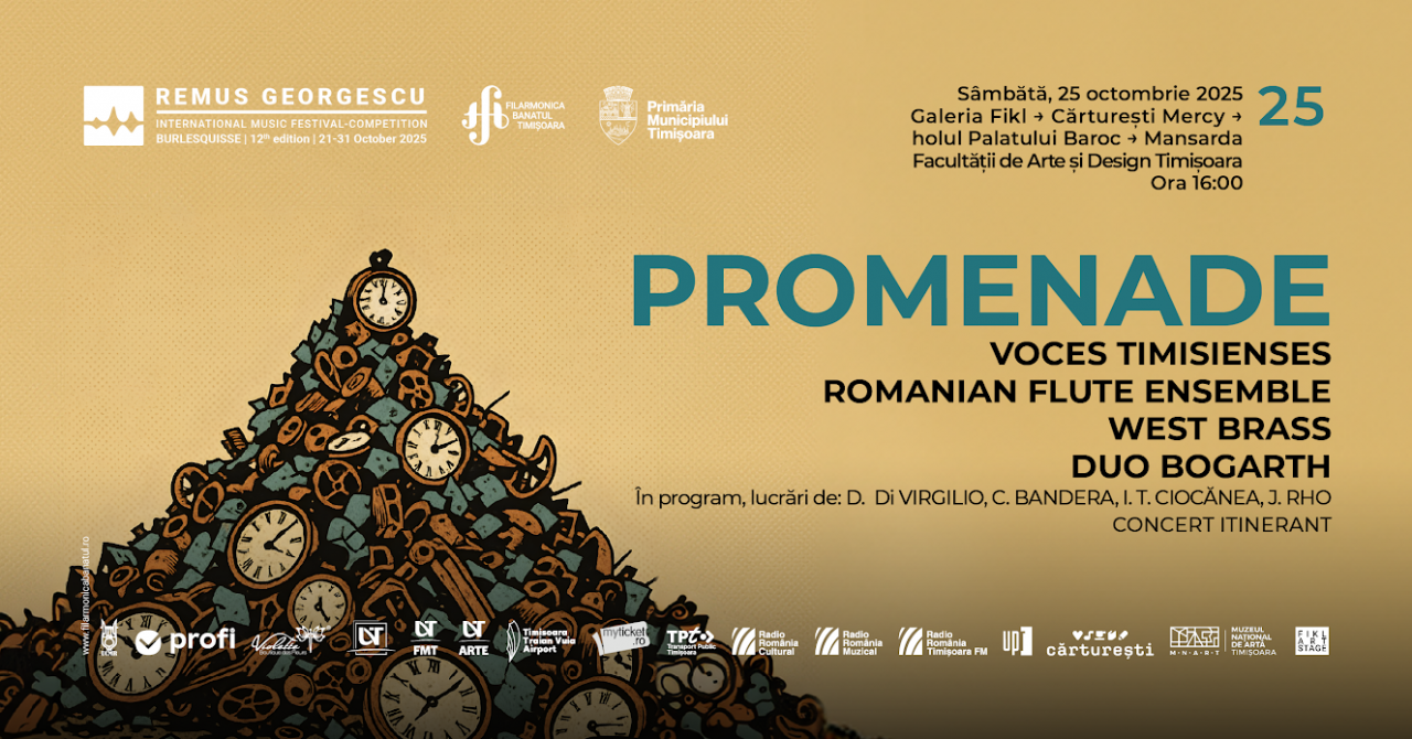 Concert itinerant „Promenade”, cu piese muzicale contemporane interpretate de Voces Timisiensis, Romanian Flute Ensemble, West Brass și Duo BogArth vor putea fi ascultate în patru locuri – galeria Fikl, Cărturești Mercy, holul Palatului Baroc și UVT Art Center. Programul include lucrări semnate de Iuliana Teodorescu Ciocănea, Carlos Bandera, Jaebong Rho și Daniele Di Virgilio.