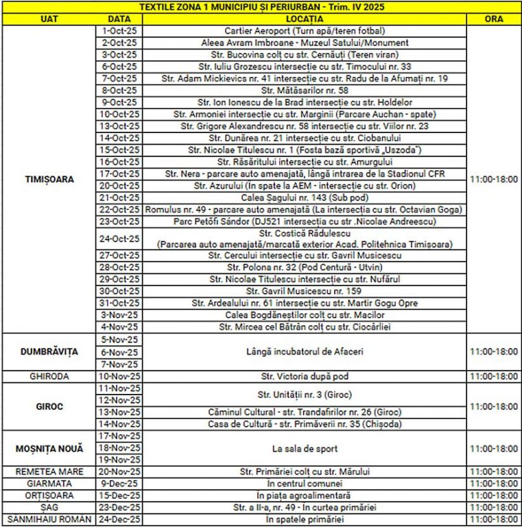 Acțiunea de colectare are loc în perioada 1 octombrie – 31 decembrie 2025 și vizează municipiul Timișoara, precum și alte 31 de localități din județ, printre care Dumbrăvița, Ghiroda, Giroc, Moșnița Nouă, Săcălaz și Sânandrei.