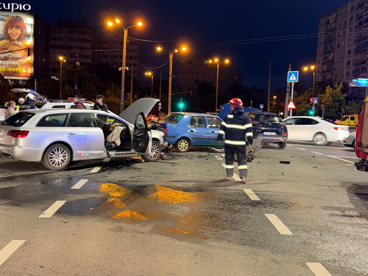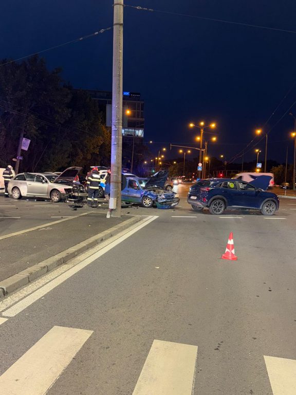 Început de săptămână cu un incident grav în traficul timișorean. Mașina condusă de un bărbat spre Calea Aradului a intrat în coliziune violentă cu nu mai puțin de trei autoturisme la intersecția cu Pasajul Iulius Town. O femeie aflată în prima mașină lovită a fost rănită.