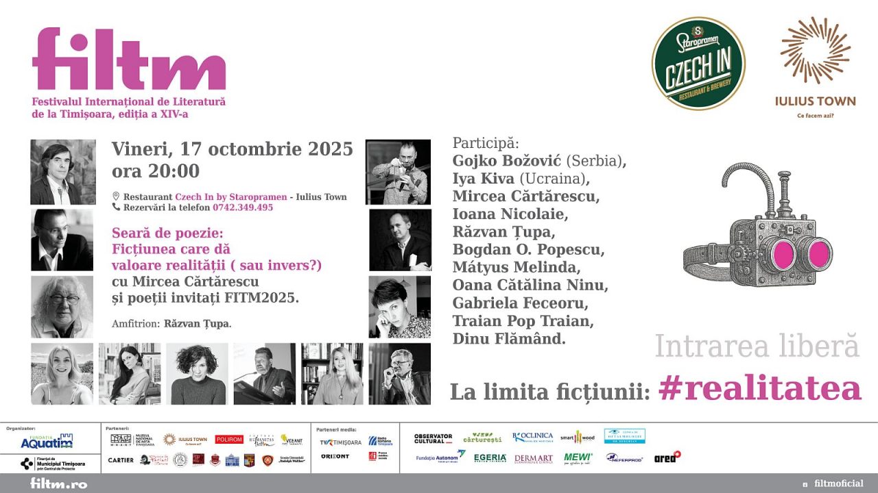 Seara de poezie se desfășoară sub tema „Ficțiunea care dă valoare realității (sau invers?)” și reunește unele dintre cele mai importante voci literare contemporane, printre care se numără Mircea Cărtărescu, Răzvan Țupa, Gojko Božović, Iya Kiva, Ioana Nicolaie, Bogdan O. Popescu, Gabriela Feceoru, Dinu Flămând și alte nume consacrate.