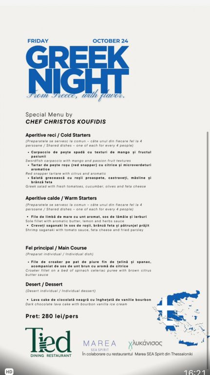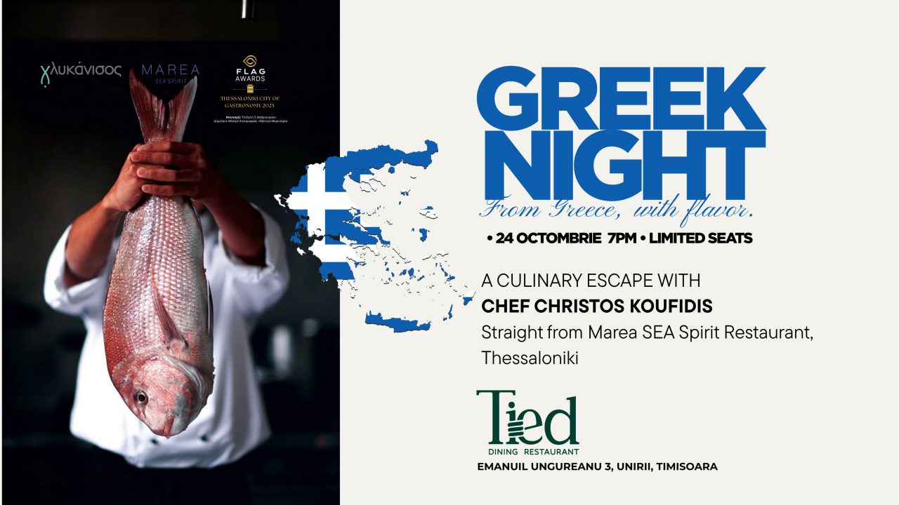 Restaurantul Tied din Piața Unirii se pregătește să găzduiască un eveniment culinar de excepție: Greek Night, care promite să aducă spiritul și aromele autentice ale Greciei în inima orașului. Seara specială va avea loc joi, 24 octombrie 2025, începând cu ora 19:00.