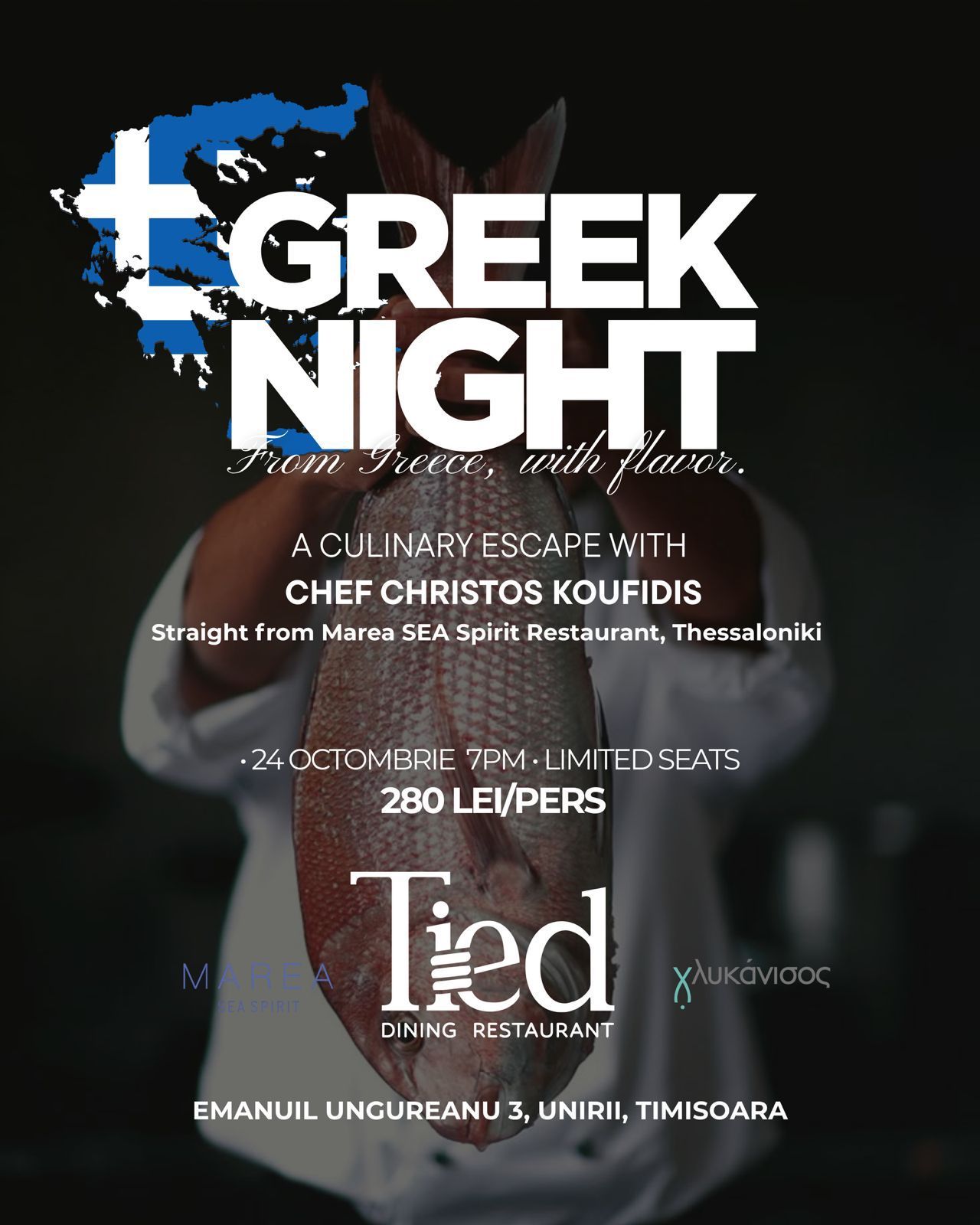 Punctul central al evenimentului este prezența celebrului Chef Christos Koufidis, sosit direct de la restaurantul Marea SEA Spirit din Salonic (Thessaloniki). Marea SEA Spirit este unul dintre cele mai apreciate localuri din Grecia, fiind distins cu prestigiosul FLAG Award 2025 – Thessaloniki City of Gastronomy, o recunoaștere echivalentă cu o stea Michelin.