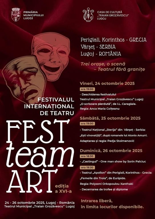 Timp de trei zile, în perioada 24-26 octombrie, scena teatrului „Traian Grozăvescu” din Lugoj va fi locul de desfășurare a unuia dintre cele mai importante evenimente culturale ale toamnei în orașul de pe Timiș: Festivalul Internațional de Teatru „FestteamArt”, aflat la a XVI-a ediție, care aduce pe scenă actori din Grecia, Serbia și România.