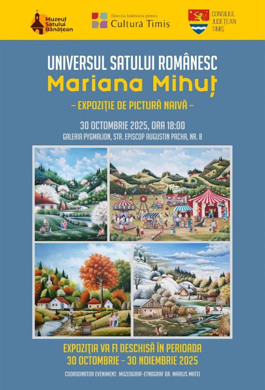 Expoziția de pictură naivă „Universul Satului Românesc” organizată de Muzeul Satului Bănățean Timișoara în parteneriat cu Direcția Județeană pentru Cultură Timiș la Galeria Pygmalion de la Casa Artelor, care prezintă lucrări semnate de Mariana Mihuț din satul arădean Brusturi, va fi vernisată joi, 30 octombrie, la ora 18:00 și va putea fi vizitată timp de o lună, până în 30 noiembrie.