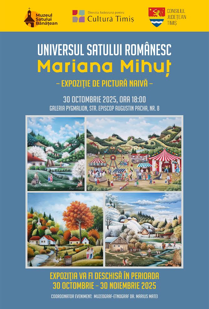 Expoziția de pictură naivă „Universul Satului Românesc” organizată de Muzeul Satului Bănățean Timișoara în parteneriat cu Direcția Județeană pentru Cultură Timiș la Galeria Pygmalion de la Casa Artelor, care prezintă lucrări semnate de Mariana Mihuț din satul arădean Brusturi, va fi vernisată joi, 30 octombrie, la ora 18:00 și va putea fi vizitată timp de o lună, până în 30 noiembrie.