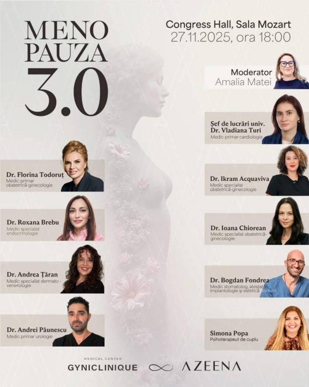 Organizatǎ de dr. Florina Todoruț, medic primar obstetricǎ-ginecologie, fondator Gyniclinique & AZEENA, cu o vastǎ experiențǎ în abordarea integrativǎ a femeii în perimenopauzǎ şi menopauzǎ.