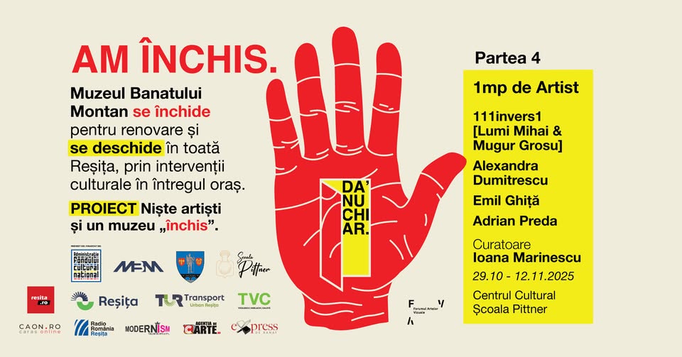 Muzeul Banatului Montan continuă seria de manifestări intitulată „Niște artiști și un muzeu «închis». Atunci când arta angajează un public plictisit”, prin expoziția „1MP de Artă 1MP de Artist” deschisă la Școala Pittner până în 12 noiembrie. Expoziția reunește cinci artiști contemporani – grupul 111 Invers 1 – format din Lumi Mihai și Mugur Grosu, Alexandra Dumitrescu, Emil Cristian Ghiță și Adrian Preda – invitați să își asume provocarea unui spațiu simbolic delimitat: un metru pătrat. Fiecare artist primește acest interval fizic ca teritoriu suveran, fără ierarhii sau constrângeri, pentru a demonstra că esența unei idei poate exista în forme compacte, dense și autonome.