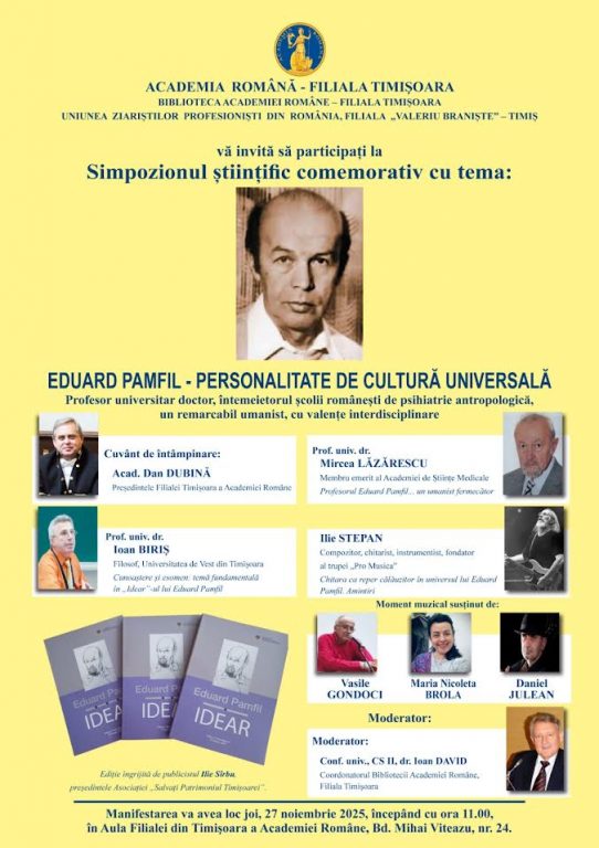 Simpozionul comemorativ „Eduard Pamfil – Personalitate de cultură universală”, organizat de filiala Timișoara a Academiei Române pentru a-l omagia pe ilustrul academician Eduard Pamfil, întemeietor al psihiatriei antropologice românești și una dintre cele mai luminoase figuri umaniste ale secolului, a reunit astăzi în aula Academiei medici, cercetători, foști studenți ai profesorului și oameni de cultură, retrăind memoria unui intelectual care a unit medicina, filosofia, teologia, muzica și poezia într-o viziune culturală unică.