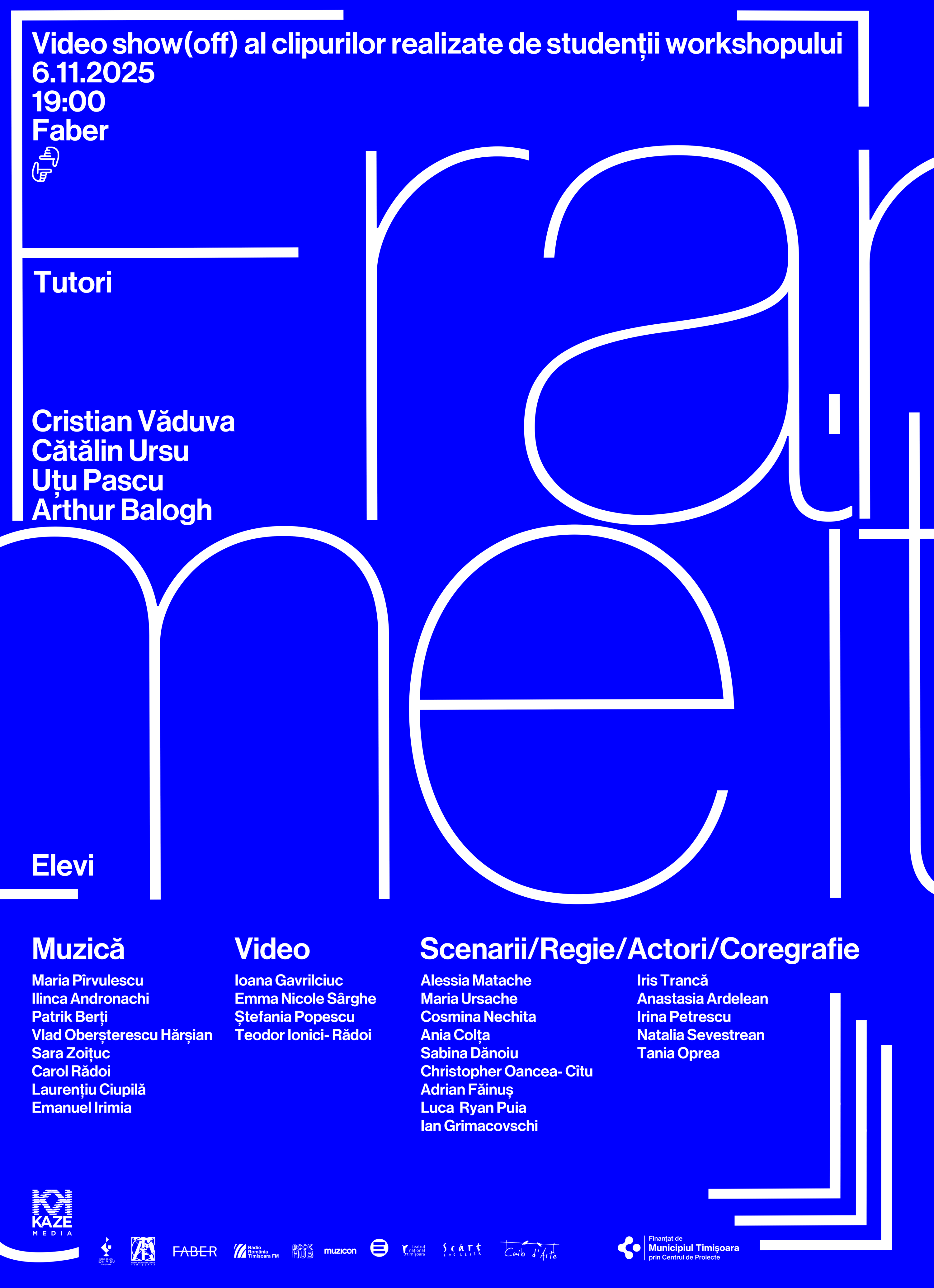 Inițiativa Frame It este finanțată de Municipiul Timișoara, prin Centrul de Proiecte, în cadrul programului Școli Creative, și contribuie la formarea unei generații de tineri artiști pregătiți să se exprime prin mijloace vizuale contemporane, consolidând legătura dintre mediul educațional și industriile creative.