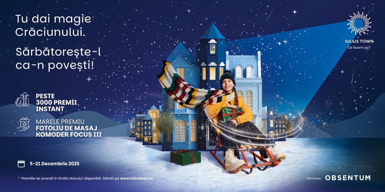 La Iulius Town Timișoara, „Tu dai magie Crăciunului”. Atmosfera festivă, decorurile spectaculoase și experiențele de shopping se împletesc anul acesta cu surprize pregătite special pentru tine, transformând achizițiile de sezon în recompense pe loc și într-o șansă de a câștiga marele premiu al campaniei, un fotoliu de masaj Komoder.