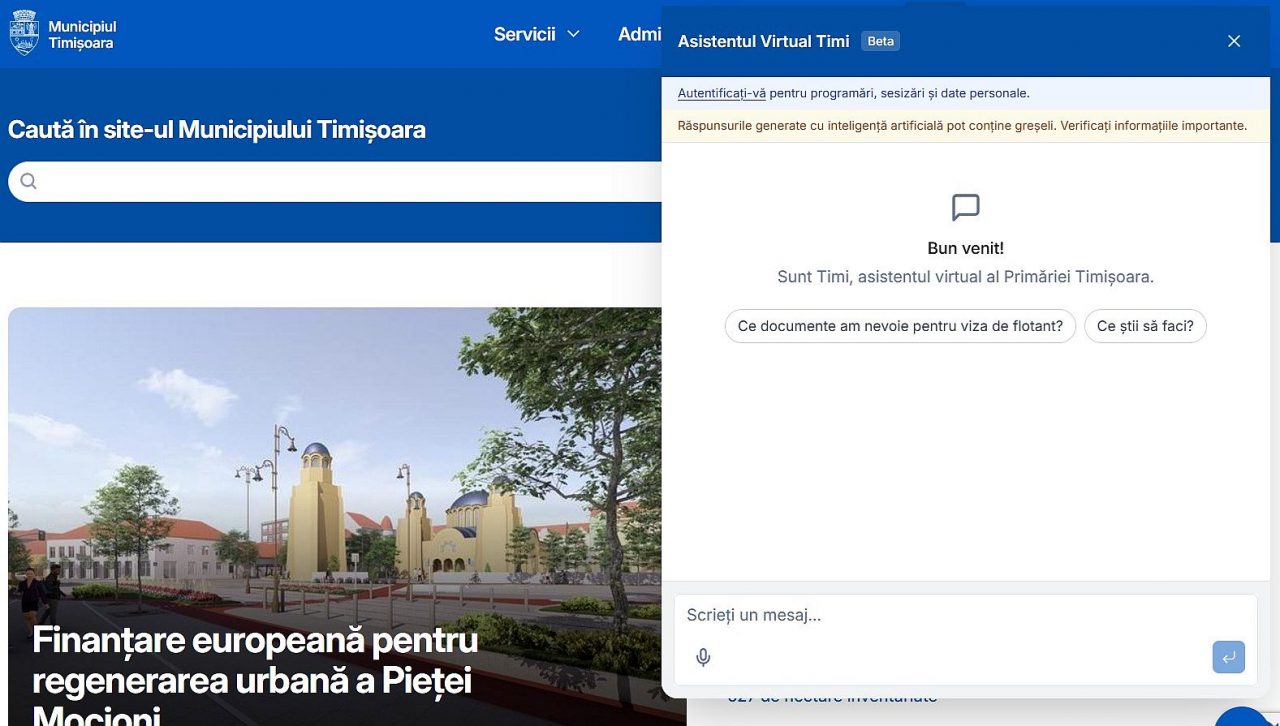 Primăria Timișoara a anunțat lansarea unui serviciu de asistență virtuală bazat pe inteligență artificială, integrat în Contul Unic, utilizat de peste 141.000 de timișoreni. Asistentul digital „Timi” oferă informații 24 de ore din 24, într-un mod simplu și rapid, fără a mai fi necesară consultarea mai multor pagini sau documente.