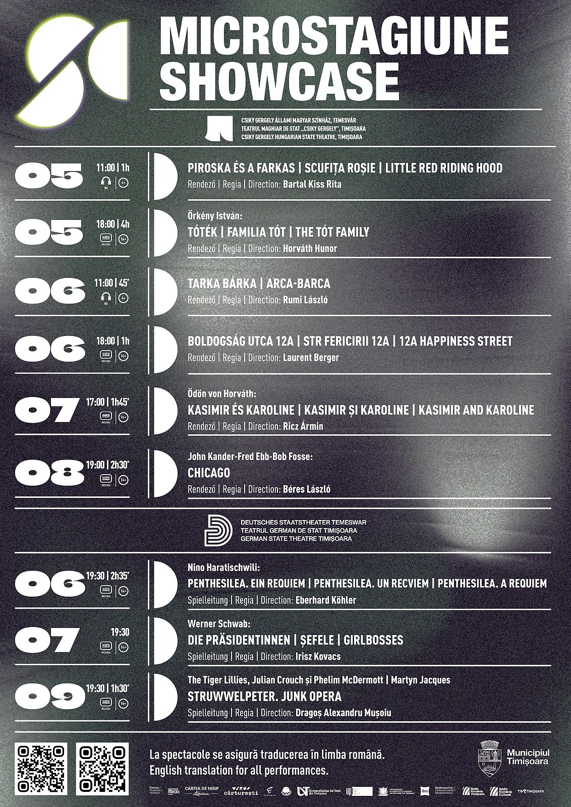 Programul „Showcase 2026” reunește șase producții recente ale teatrului maghiar, de la spectacole pentru copii la dramaturgie clasică și contemporană, alături de trei spectacole ale teatrului german. Microstagiunea începe joi, 5 februarie, la ora 11:00, cu spectacolul pentru copii „Scufița Roșie”, o reinterpretare ludică a basmului clasic sub forma unei operete, care va avea loc în sala Studio, și în aceeași zi, de la ora 18:00, în sala mare va fi jucată recenta premieră „Familia Tót”. În 6 februarie, de la ora 11:00, sala Studio găzduiește spectacolul muzical pentru copii „Arca-Barca”, iar de la ora 18:00, în aceeași sală, va avea loc ultima premieră, „Strada Fericirii 12A”. Sâmbătă, 7 februarie, de la ora 17:00, tot în sala Studio este programat spectacolul „Kasimir și Karoline”, iar în 8 februarie, în sala mare va avea loc musicalul „Chicago”.
