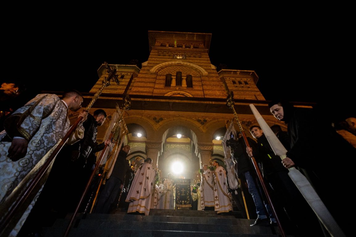 Credincioșii au parte în acest an de vreme bună și au venit să ia din Lumina Sfântă sosită în oraș în seara de sâmbătă pe calea aerului. După miezul nopții ÎPS Ioan, Mitropolitul Banatului, i-a îndemnat pe oameni să ducă vestea cea bună mai departe: Hristos a Înviat. S-a ieșit afară pentru tradiționala înconjurare a catedralei și s-a împărțit totodată lumină timișorenilor care așteptau în centrul orașului. Ulterior va urma slujba de Înviere.