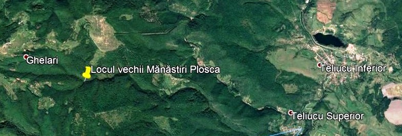 Pe o carte slavonă de la începutul secolului al XVIII-lea, o însemnare descifrată de Nicolae Iorga se referă la „Mănăstirea de la Plosca cia din gios”, iar o alta, mai târzie, precizează că „…această Mănăstire este așezată departe de acele sate și se găsește în mijlocul pădurii”. Relatări despre existența mănăstirii există și la începutul veacului trecut, dar acestea mai vorbesc doar de crucea ridicată în pădure în amintirea mănăstirii, „…pe vale, sub hotarul comunei Ghelari”.